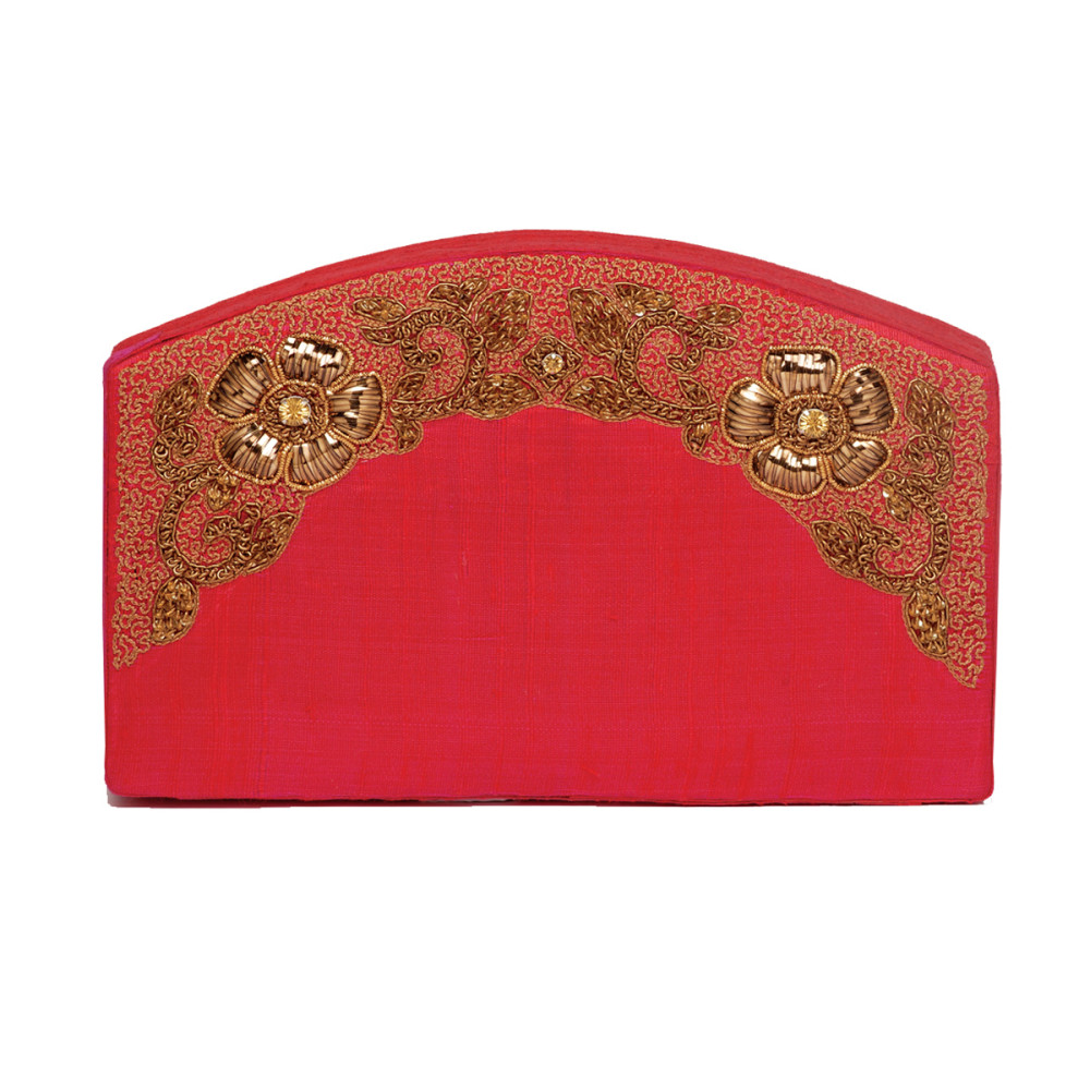 Pink color raw silk clutch embellished with thread and badla handwork using zardozi technique. Every piece of embellishment is hand sewn and not glued hence giving a sturdy long lasting finish.