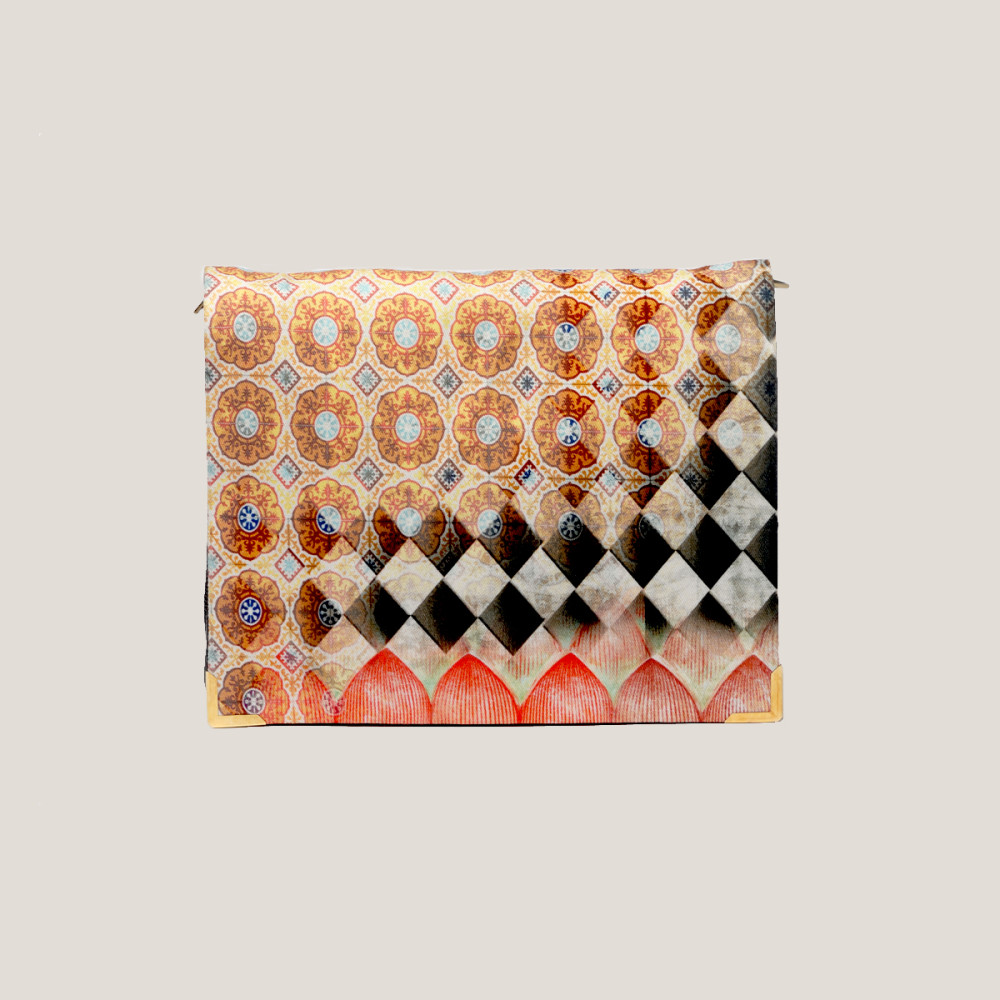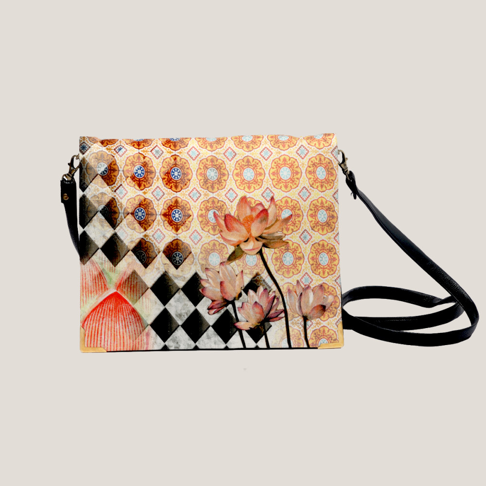 The print on this clutch is inspired by the Ancient floor art of India and the national flower of India.