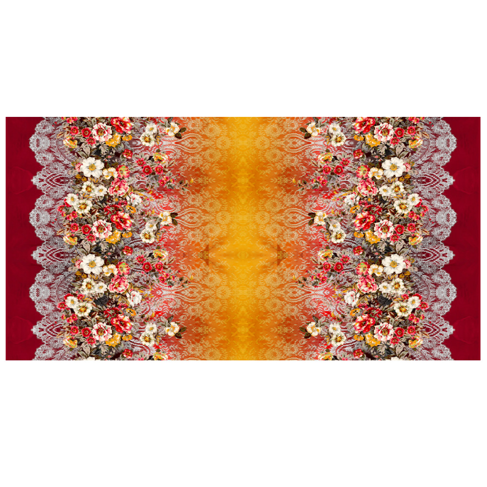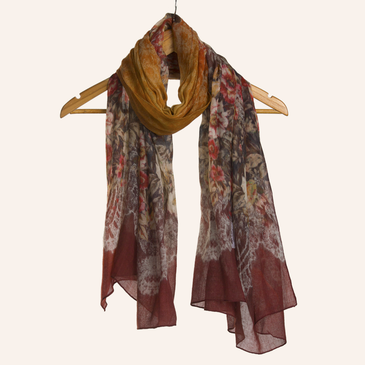 This luxuriously soft silk and wool scarf with floral and lace design gives a modern yet classy look. It is printed digitally. Perfect for cold weather.