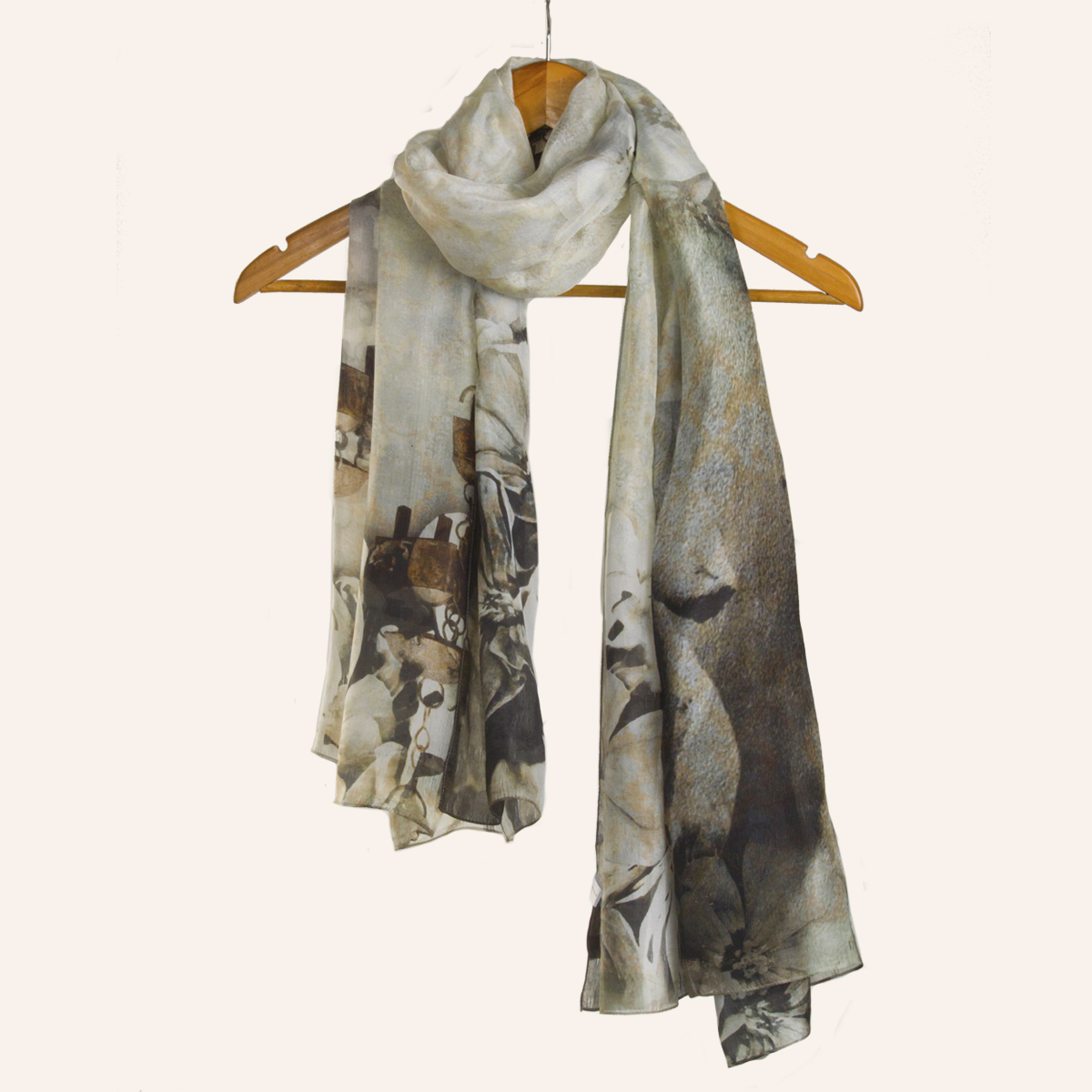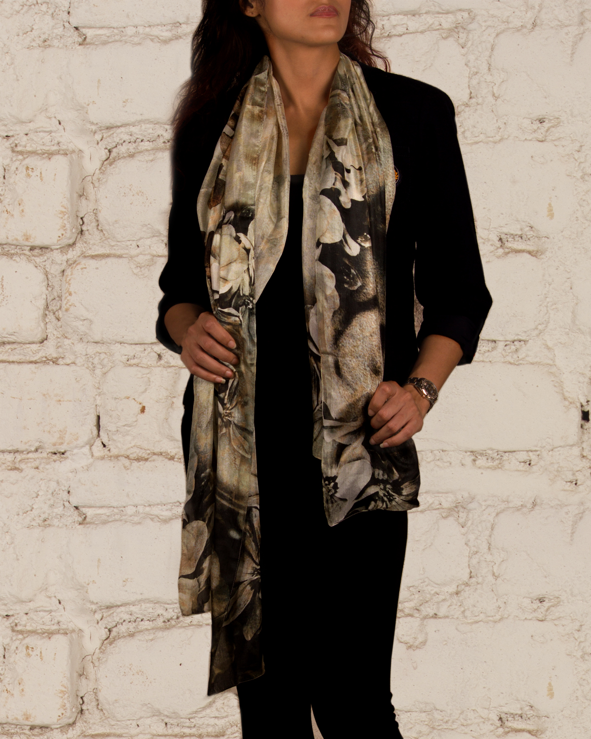 Luxury blends with tradition in this gorgeous silk scarf . The image depicting idol of Durga Ma with folded hand symbolizing victory of good over evil. She is the most powerful incarnation of a goddess in Indian mythology.