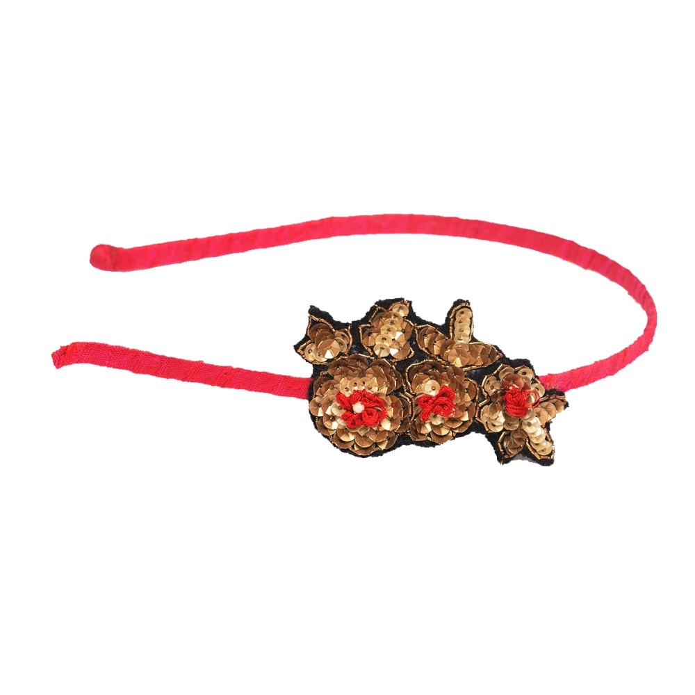 A pretty pink silk headband with a floral bunch made of sequence and zardozi hand work.