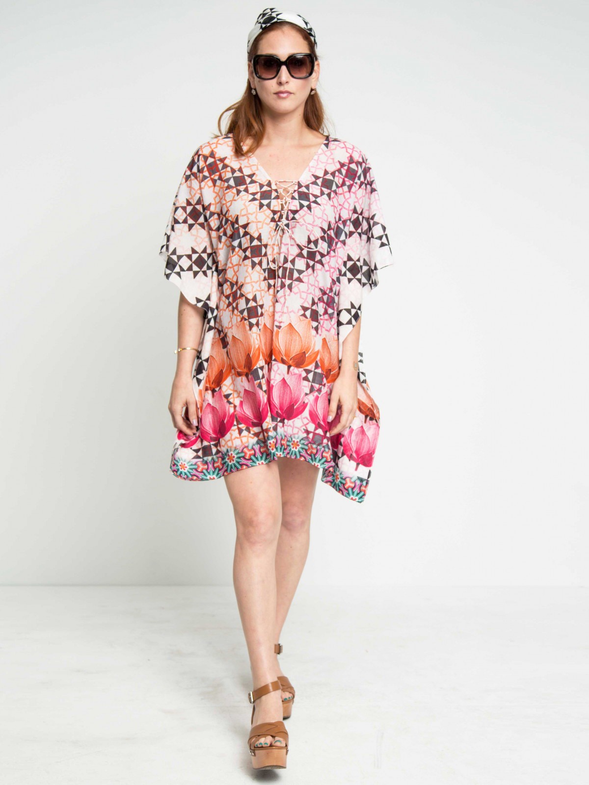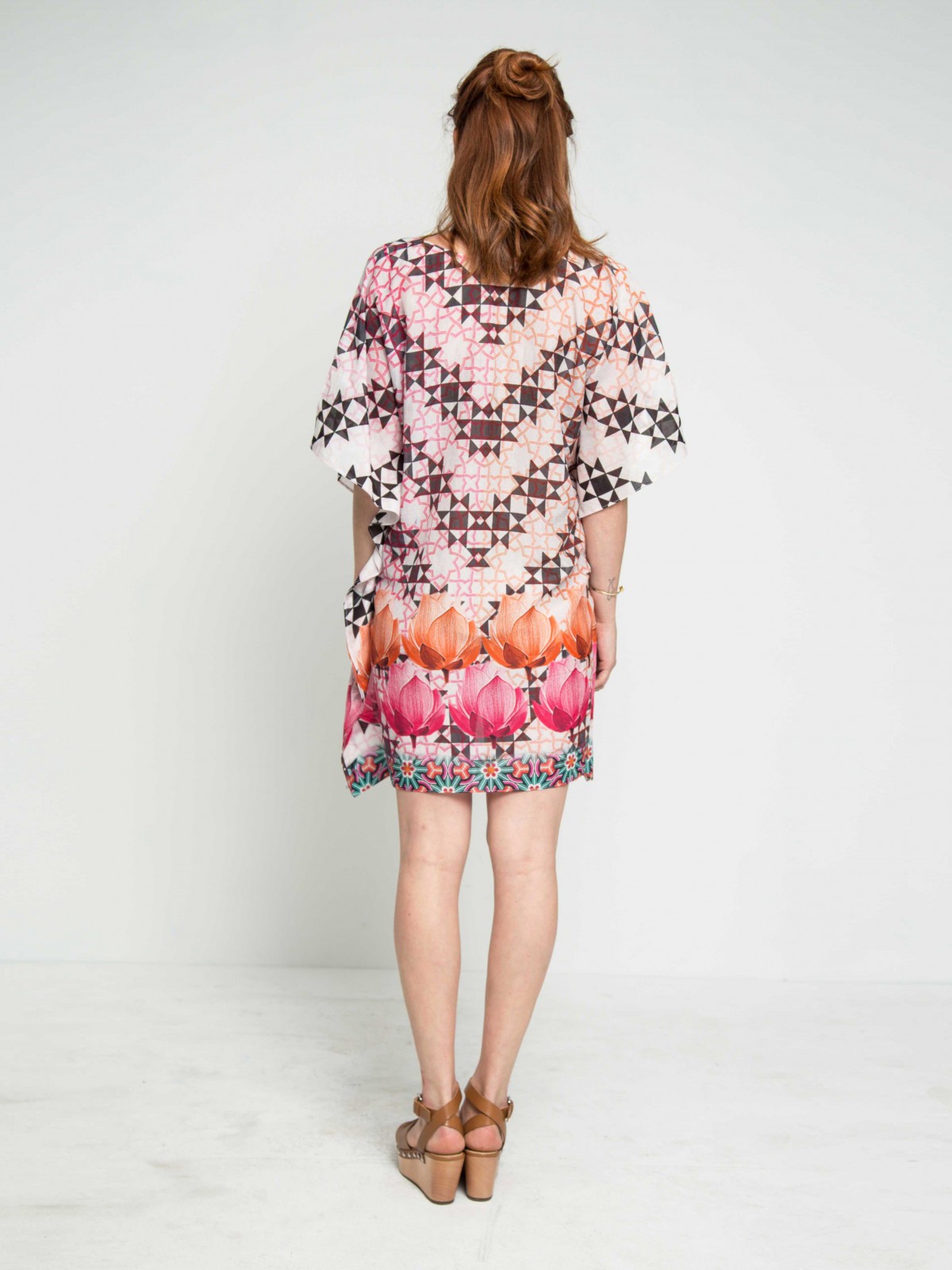Gorgeous avant garde print, inspired by breathtaking geometrical pattern and floor artwork of India. The pop of Pink and Orange lotus makes it fun and playful. Cotton Silk is one of our favorite fabrics, it is airy, and has right amount of sheen and drape. Wear it to the beach or lounge in it by the poolside!