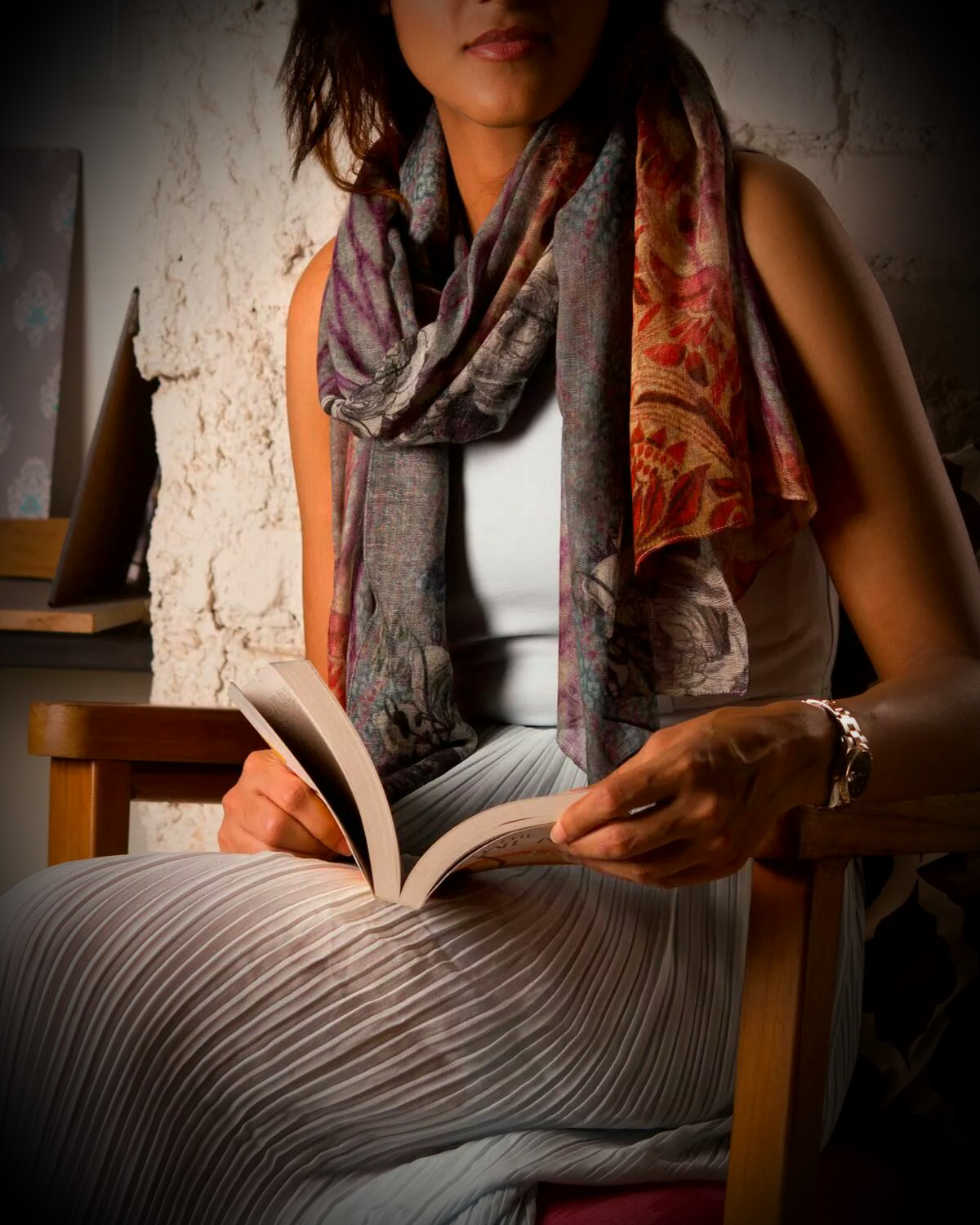A gorgeous combination of warm and soothing hues kissed with white rose bunches surely makes a style statement. This digitally printed scarf is perfect for cold weather.